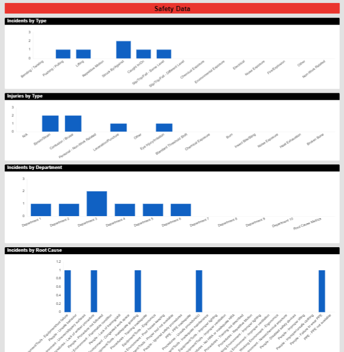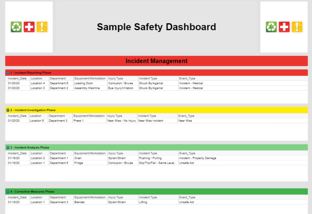 This dashboard allows you to see the current state of all your incidents, what phase or stage they are in, a chart of incidents by type, injury, location, root cause, etc.
